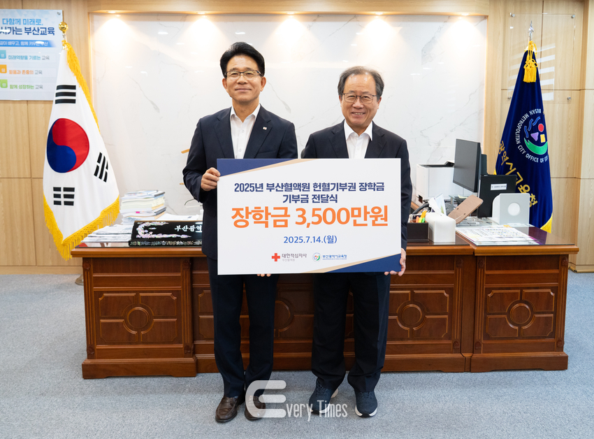 부산교육청은 14일 본청 교육감실에서 대한적십자사 부산혈액원로부터 학업에 열의가 있는 부산시내 고등학생을 위한 교육기부금을 전달 받았다.